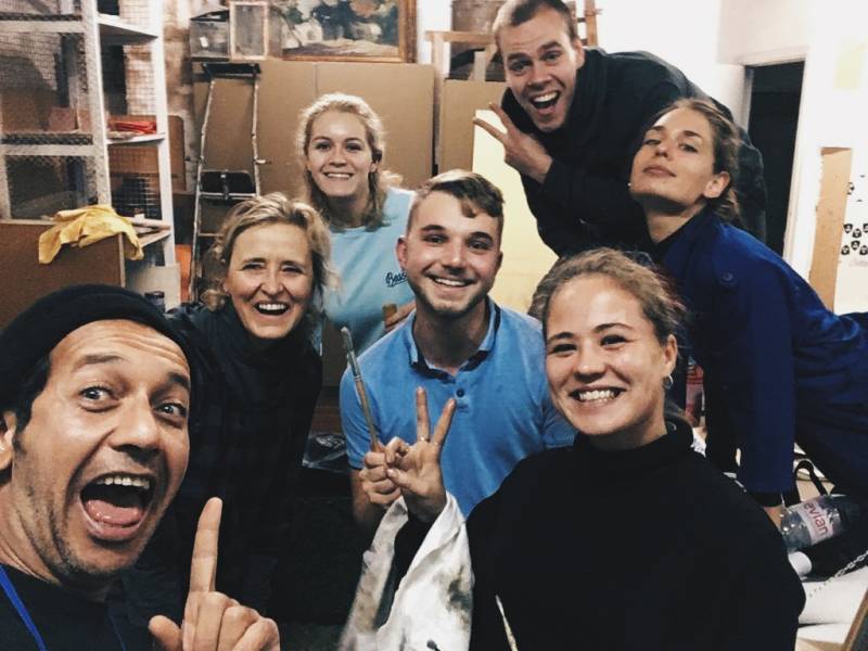 Zoals ik al eerder verteld heb woon ik in het huis tegenover de school. Dit pand is van dezelfde eigenaar als de school en is eigenlijk opgesplitst in twee delen. Beneden zit onze keuken / eetkamer en een bierbrouwerij, en boven zitten de slaapkamers, badkamers en het atelier. Het is heel erg fijn dat dit atelier er bij zit en er wordt ook goed gebruik van gemaakt. Iedere avond en ieder weekend zitten we hier met z’n alle ons werk te maken. Eigenlijk al het werk dat we maken wordt met lijnolieverf gedaan, dus het is fijn dat we dit niet op onze slaapkamer hoeven te maken. Anders ruik je echt niks anders meer dan verf. (Op de foto zie je alle huisgenoten in het atelier)