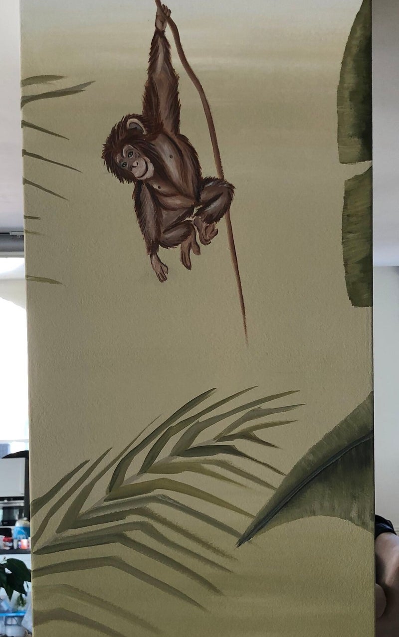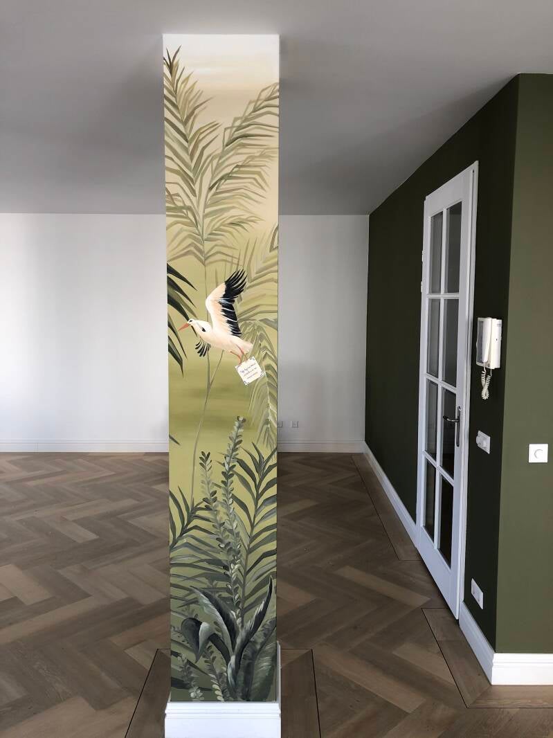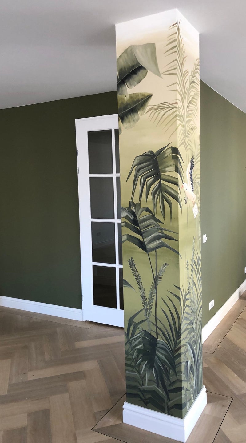 Deze dragende pilaar zou normaal een sta in de weg zijn. Op deze manier niet meer. Door er een toffe jungle op te schilderen word het een echte eye-catcher! Met mijn (kleur)advies om de wand erachter groen te sausen is de pilaar geen losstaand object, maar word het een mooi geheel met de rest van de ruimte.